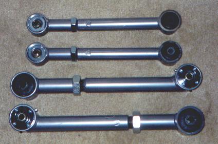 Here's what the new arms look like (the uppers are above and the lowers are below). The large nuts are jam nuts to lock in the length once the pinion angle is properly set:
