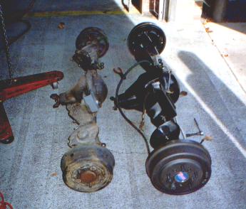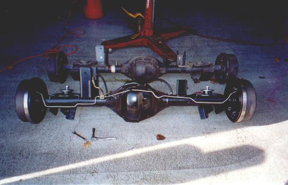 | 11. Transfer the brake lines, axle vent line, and sway bar (if desired) from the old axle to the new axle. The brake lines required a few minor re-bends to get it just right. Later, I used 150 pound marine zip ties to secure the brake line to the housing. The vent line was a bit too short now, since the vent is not in the same location on the new axle as the old axle. I did not transfer the sway bar as it doesn't really do much other than limit droop. On stock axle setups, this is necessary to prevent the springs from falling out, but this is not necessary with the new brackets. |