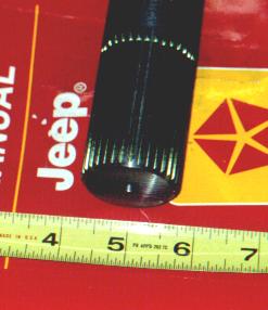 | 15. Re-install the rear drivehshaft. At this point, I installed the Boggers and cycled the axle up and down to check the tire to body clearance, the shock length, differential cover plate to gas tank clearance, and driveshaft length. The tires barely rub the rear of the fender when the axle is raised on one side only. The amount of rubbing will be easily eliminated with a little trimming once I get the new fender flares. The shocks were just barely too short (by about 1/8"). I might add limiting straps at some point to prevent damage to the shocks. The differential cover plate cleared the gas tank skid plate by a scant 1/8". The drive shaft was too long by about 1/2" and was removed. |
